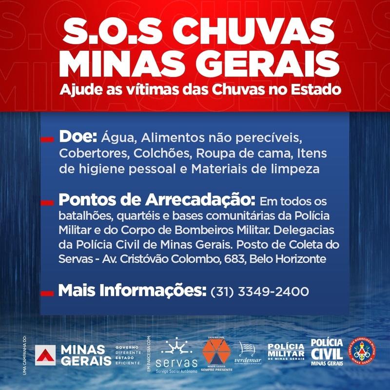 Para arrecadar donativos para os desabrigados e desalojados, o Serviço Social Autônomo (Servas) criou a campanha “SOS Chuvas Minas Gerais”. Os itens mais solicitados são água, alimentos não perecíveis, cobertores, colchões, roupas de cama, itens de higiene pessoal e material de limpeza.