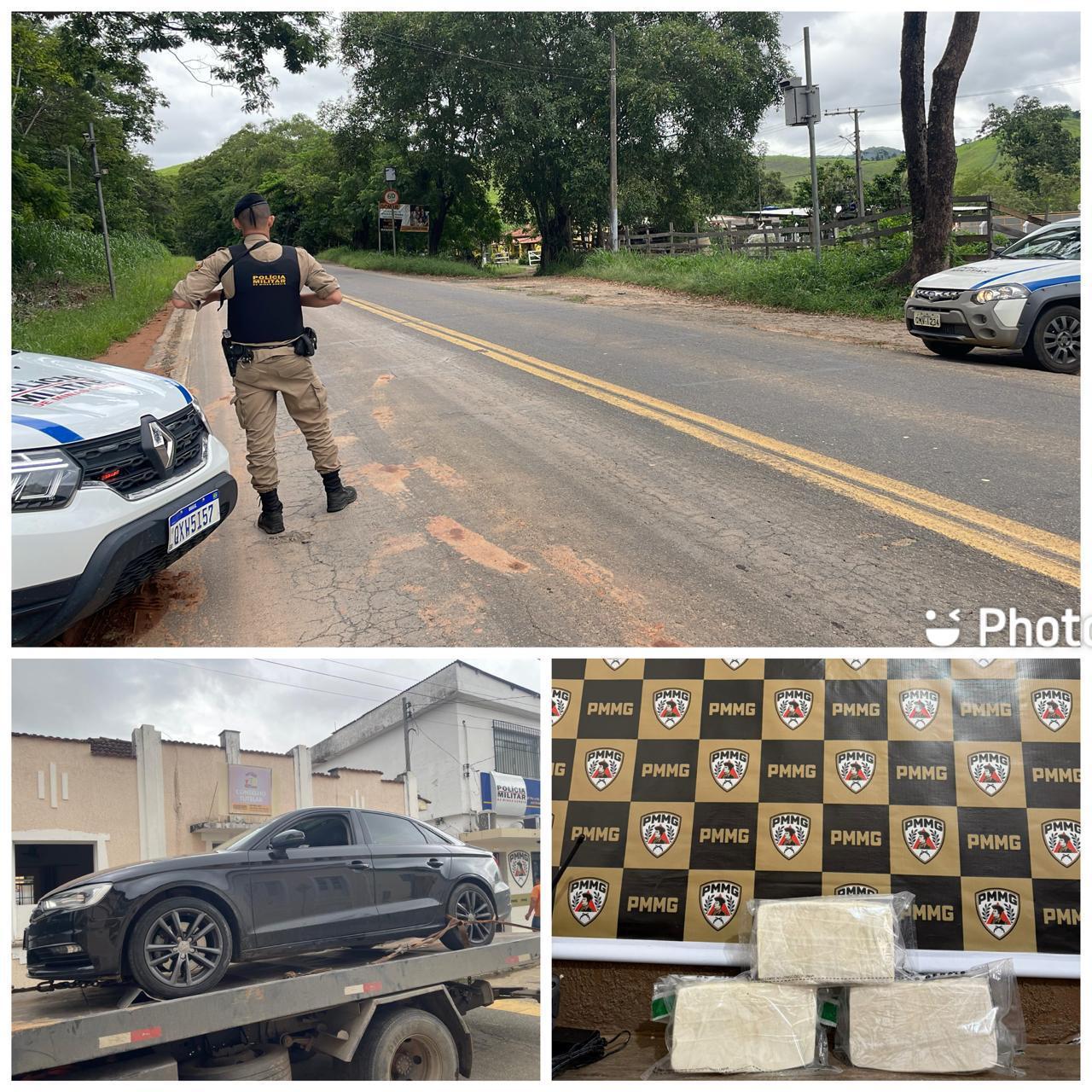 Em Tabuleiro, após denúncia relacionada ao tráfico de drogas, a Polícia Militar realizou monitoramento e, após cerco e bloqueio, interceptou um veículo na Rodovia MG-133, Km 16, na região central do município.