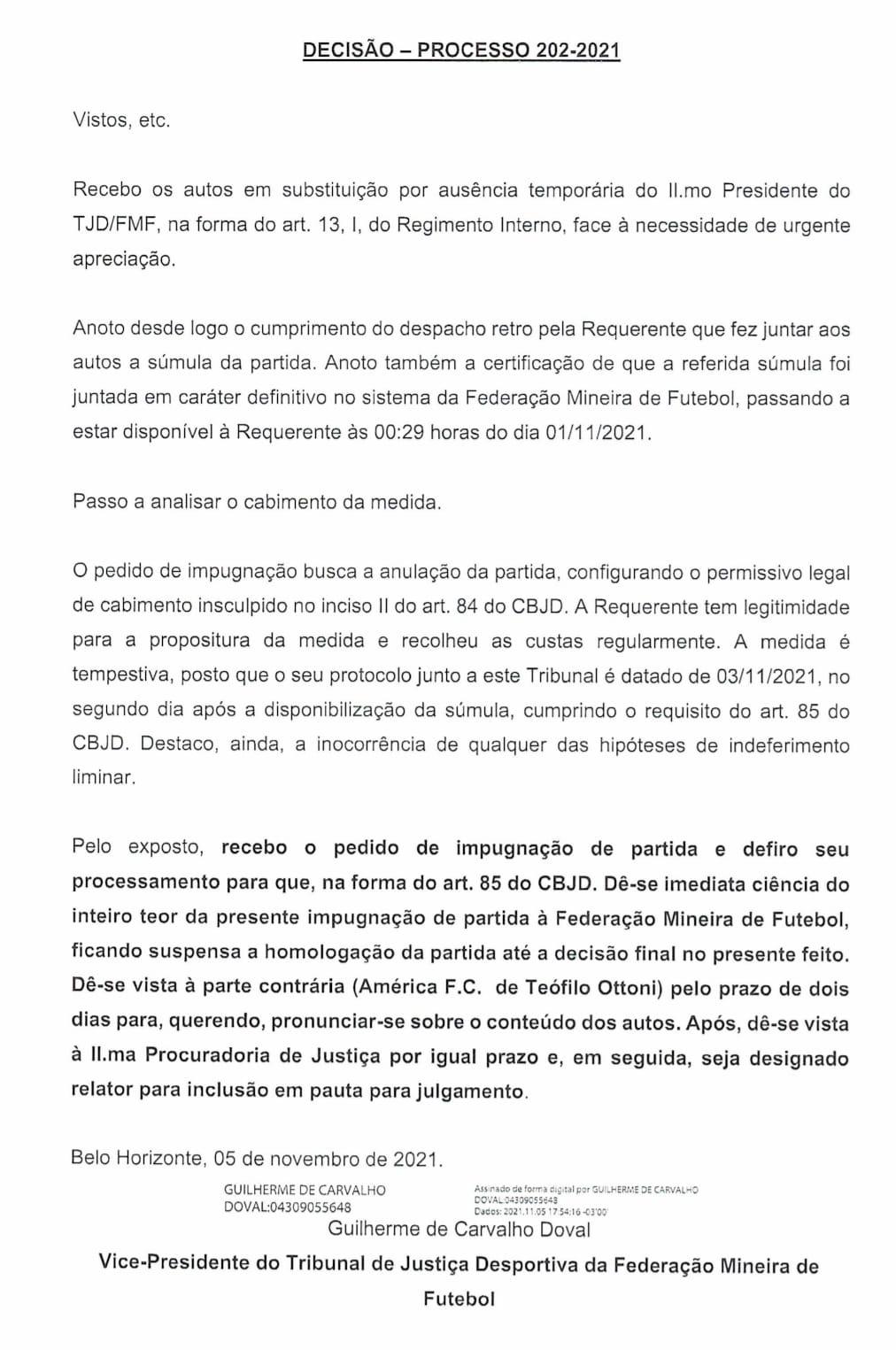 No documento, o time de Juiz de Fora alega “erro de direito” e “interferência externa” e solicita a não homologação do resultado da partida até que o caso seja julgado, bem como a intimação do clube de Teófilo Otoni e a anulação do jogo.