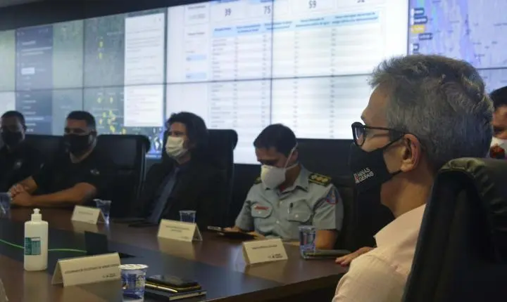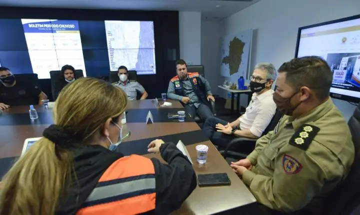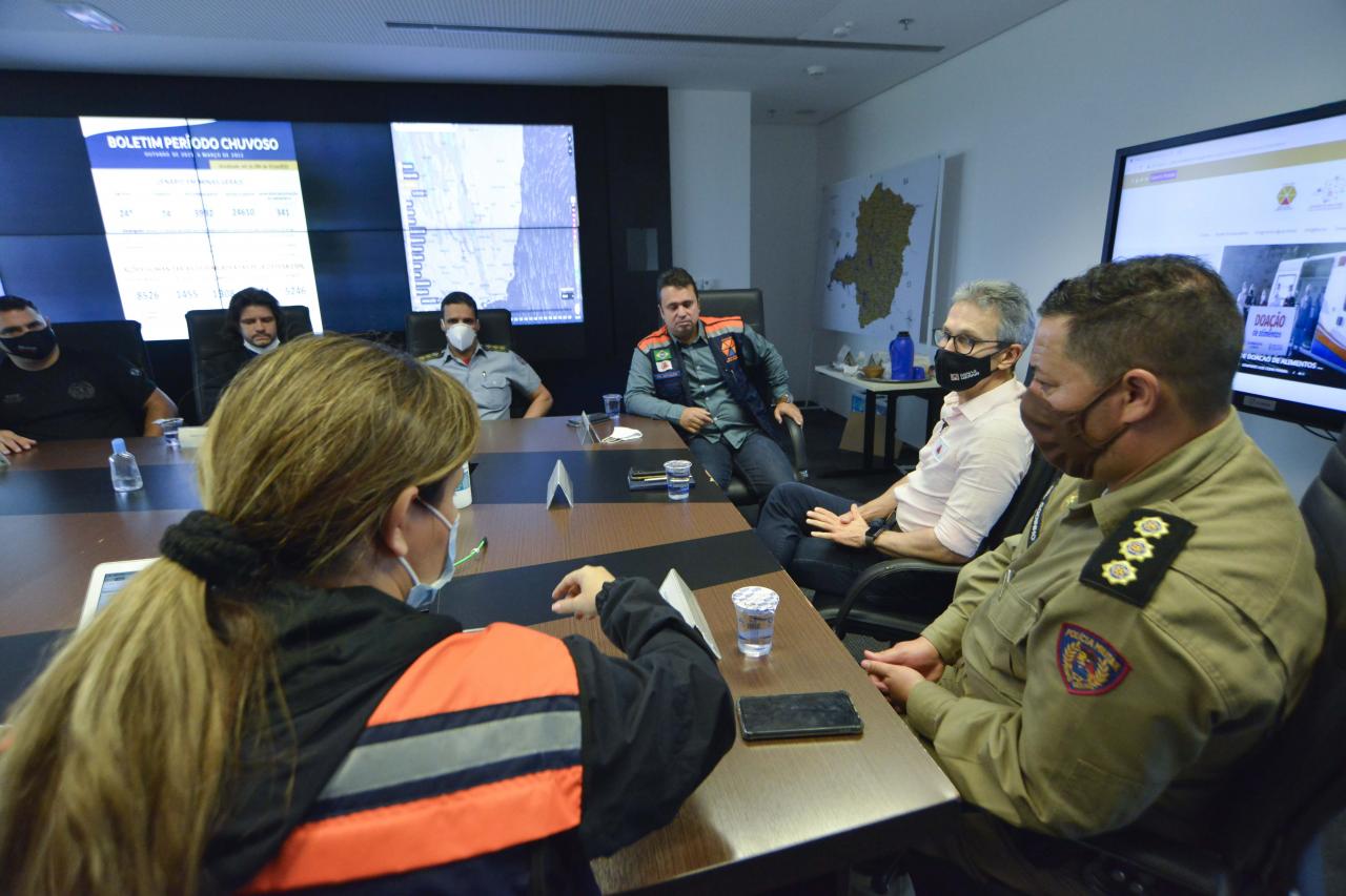 Nesta manhã, o governador Romeu Zema se reuniu com o Comitê Gestor de Medidas de Prevenção e Enfrentamento das Consequências do Período Chuvoso, no Centro Integrado de Comando e Controle (CICC), na Cidade Administrativa, e acompanhou as ações de prevenção e ajuda direta à população que estão sendo desenvolvidas pelas Forças de Segurança.