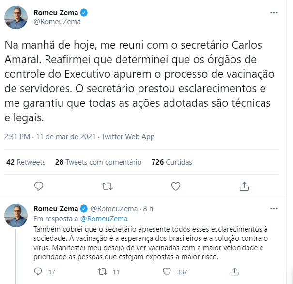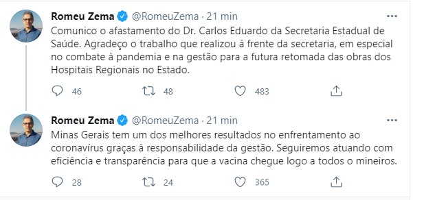 Em nota, Zema afirmou: "Agradeço o trabalho que realizou à frente da secretaria, em especial no combate à pandemia e na gestão para a futura retomada das obras dos Hospitais Regionais no Estado." A notícia veio após uma série de postagens de Zema sobre a vacina em Minas Gerais, afirmando que havia se reunido com o secretário para discutir questões referentes a apuração de vacinas em servidores do estado.